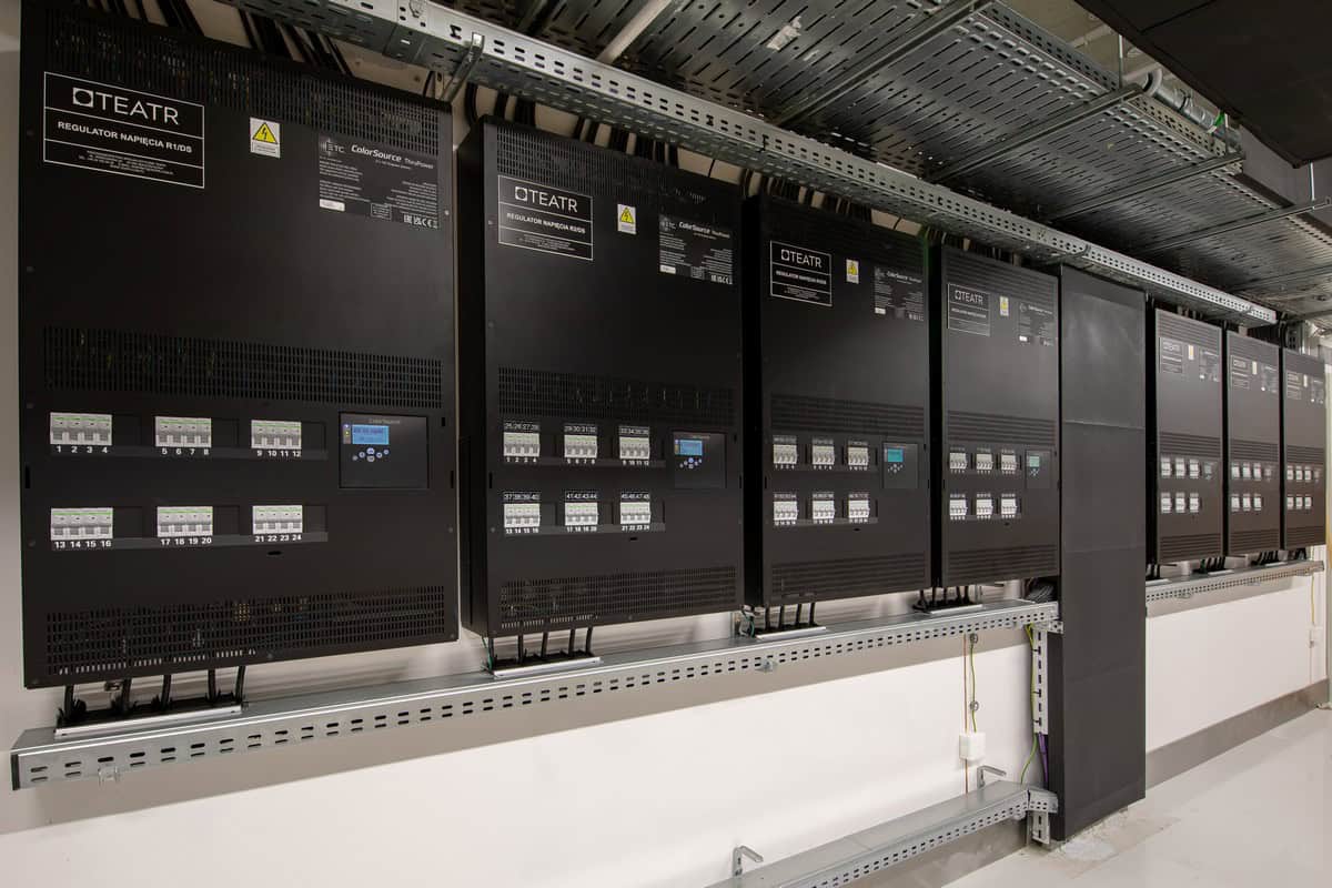 Specjaliści z firmy Przedsiębiorstwo Specjalistyczne TEATR zrealizowali zaawansowany projekt oświetlenia technologicznego Dużej Sceny, Sceny Kameralnej oraz Dużej i Małej Sali Prób. W każdej z tych stref zainstalowano rozbudowaną sieć zasilania i sygnałów sterujących do ponad 300 opraw oświetleniowych. System zasilania oparty jest na 14 regulatorach napięcia ETC ColorSource Thru Power. Wbudowana funkcja indywidualnego przypisania trybu pracy danego obwodu, m.in. trybu regulatora czy trybu nieregulowanego, znacznie wpływa na funkcjonalność w zakresie kontroli zasilania, dostosowując się do zmieniającej się technologii i związanych z tym potrzeb. Dodatkowo, na czas licznych wyjazdów lub letnich występów na dziedzińcu Teatru, realizatorzy mają do dyspozycji kompletne zestawy zasilania wyposażone w regulatory PLS PEGASUS FLX wraz z dedykowaną rozdzielnicą obwodów nieregulowanych. Oba systemy uzupełnia zestaw 10 kompaktowych, jednokanałowych regulatorów.