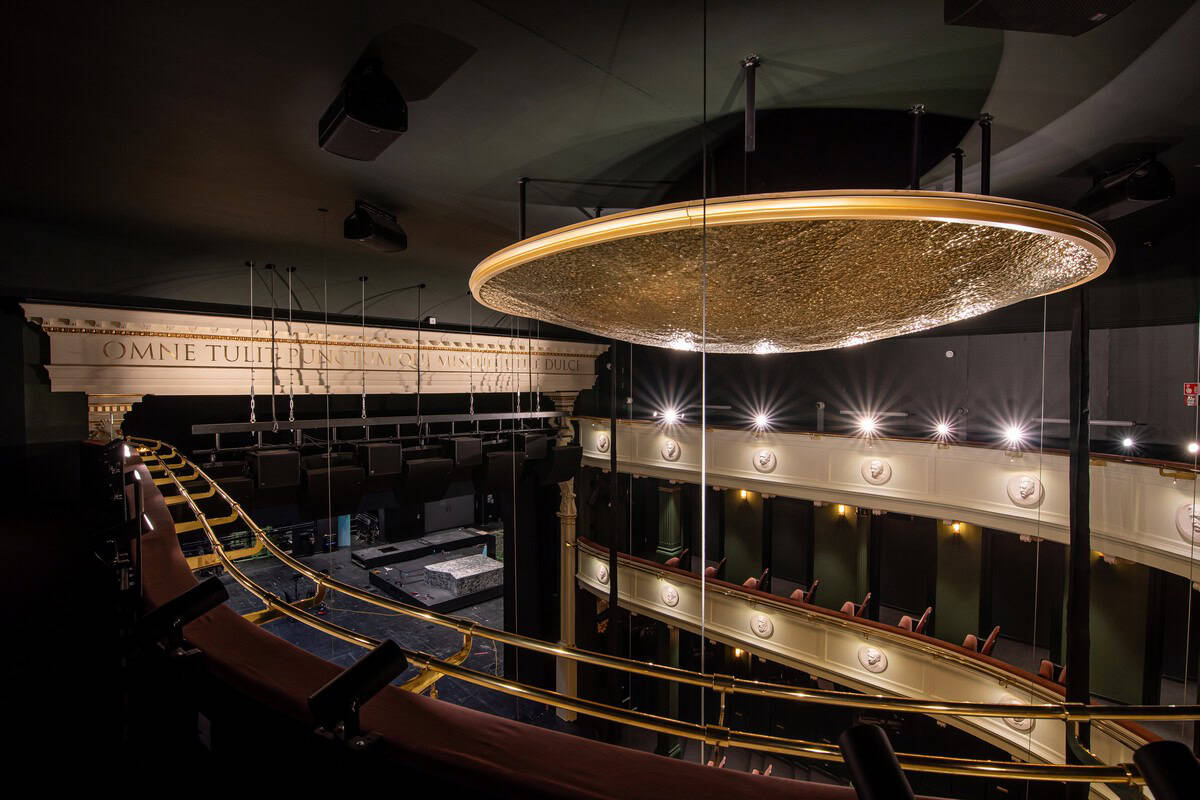 Nad publicznością zawieszono imponujący, trzytonowy plafon wykonany z ręcznie młotkowanej mosiężnej blachy, który dodatkowo wzbogaca doznania akustyczne całej sali.