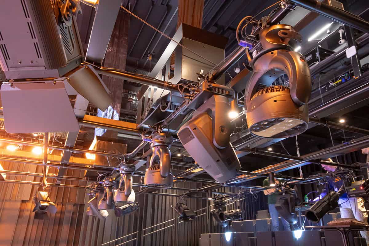 Ze względu na wymiary sceny oraz wysokość komina scenicznego, a także wynikające z tego odległości do miejsca montażu urządzeń, zastosowano urządzenia o wysokiej jasności i szerokim wachlarzu efektów scenograficznych. Na mostach oświetleniowych nad sceną zamontowano ruchome głowice Elation Fuze MAX (łącznie 12 sztuk w wersji SPOT / PROFILE), wyposażone w źródło LED (RGBMA) o mocy 800 W, dostarczające moc ponad 21 000 lumenów. Uzupełniono je o 20 sztuk dobrze znanych na rynku estradowym urządzeń efektowych CLF POSEIDON WASH XL. Na froncie, nad widownią, zamontowane zostało 6 sztuk Elation Artiste Picasso, odpowiedzialnych za precyzyjne kadrowanie i animację wiązek świetlnych o mocy ponad 23 000 lumenów, przy zachowaniu bardzo wysokiej kultury pracy. Ponadto główny system oświetlenia wspierany jest przez mniejsze, lecz również funkcjonalne modele, działające zamiennie lub równolegle na pozostałych scenach w teatrze. Spośród nich wyróżnia się 6 głowic DTS ALCHEMY WASH 5, wyposażonych w tradycyjną soczewkę Fresnela oraz zaawansowany moduł LED, gwarantujący perfekcyjne odwzorowanie kolorów (CRI > 98), oraz 12 ruchomych głów typu wash DTS NICK 1401. Zadania reflektorów typu spot realizują mniejsze urządzenia z serii wcześniej wspomnianych – ELATION Fuze SFX.