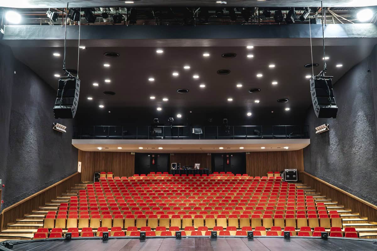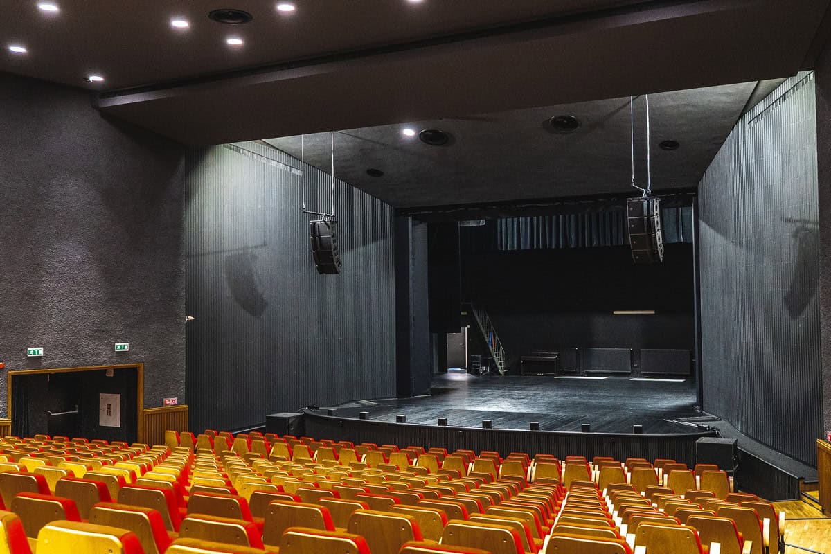 Widok widowni ze sceny, nad którą podwieszono główne grona systemu nagłośnieniowego.