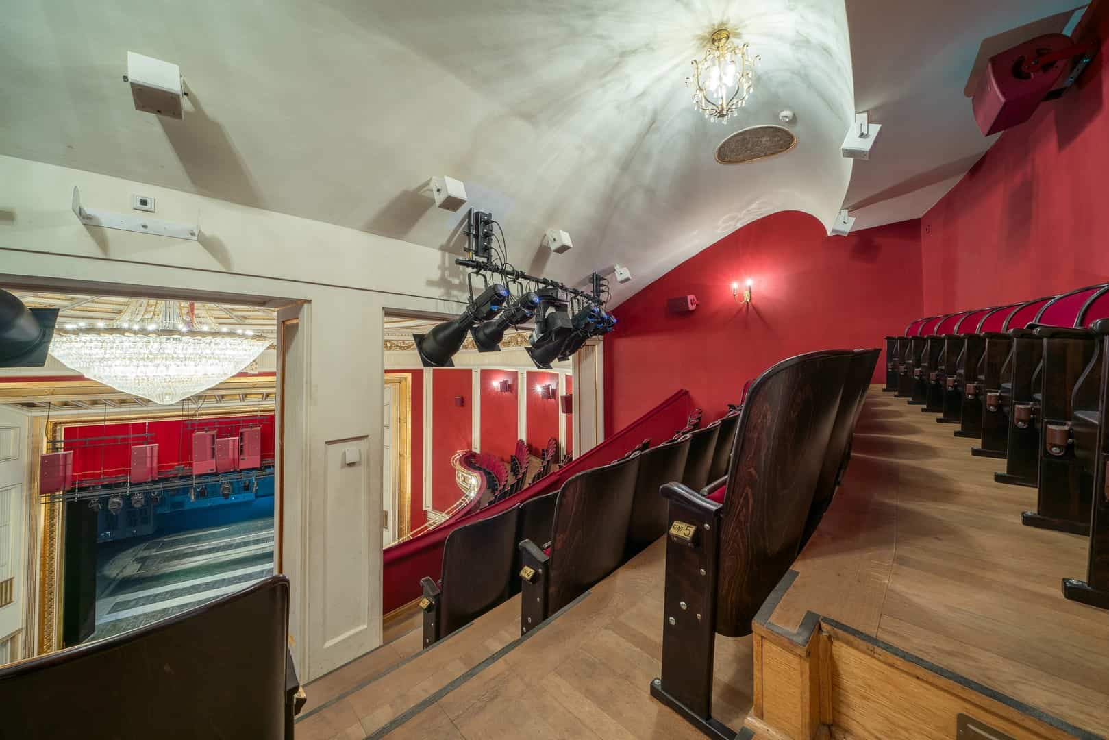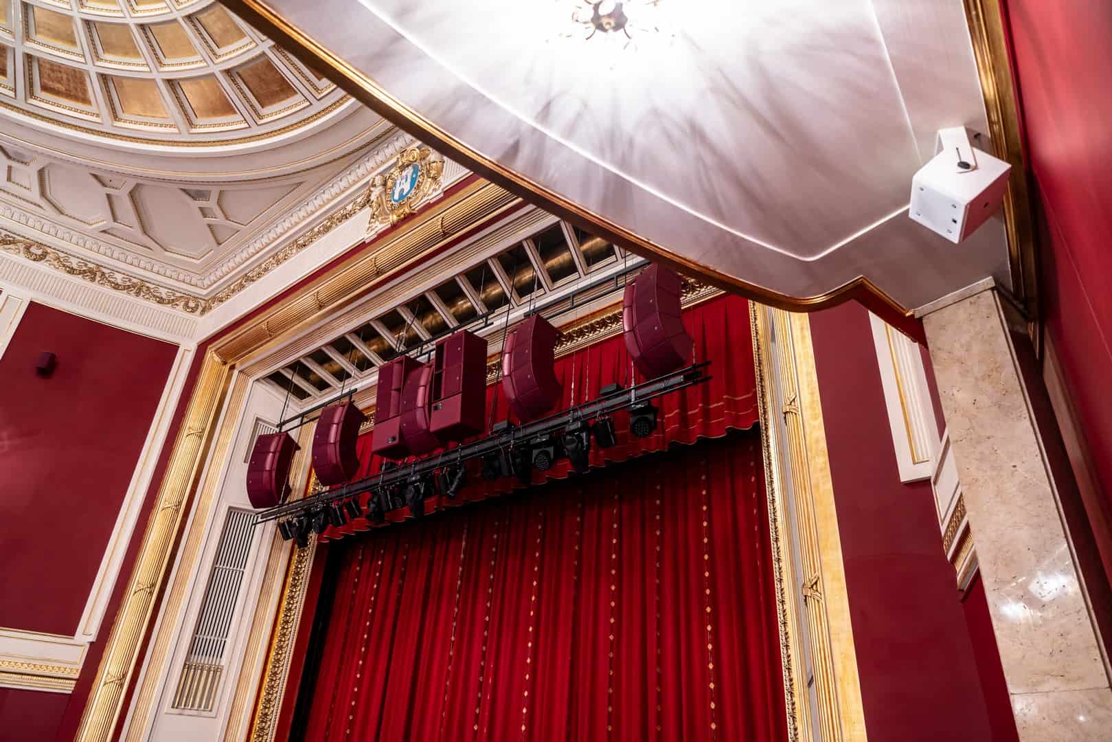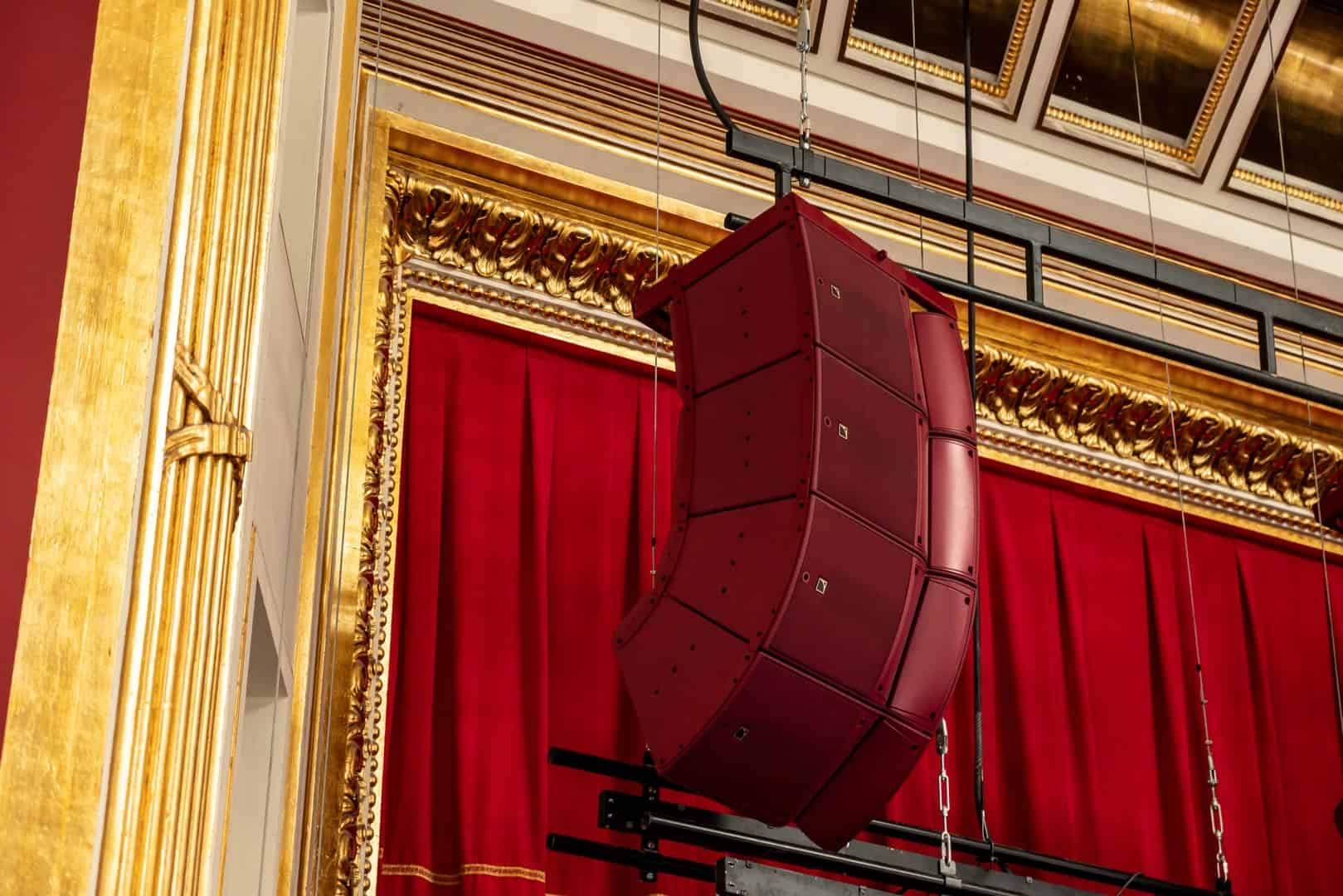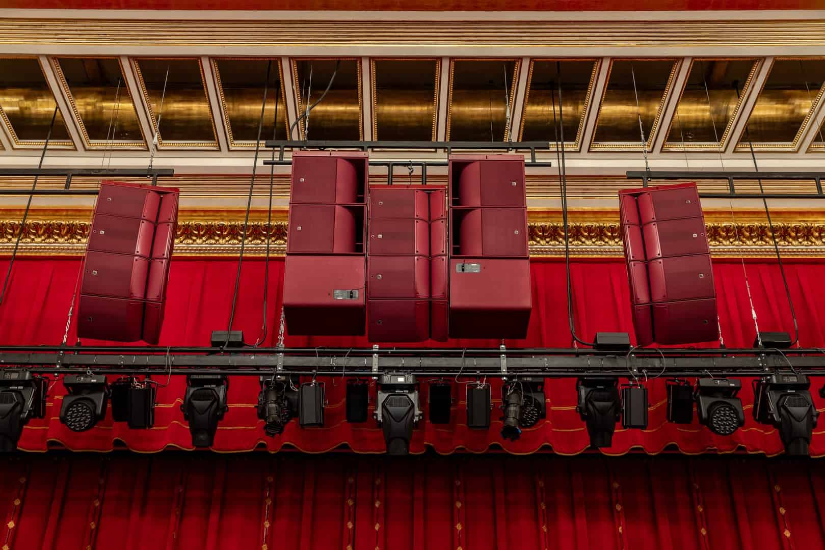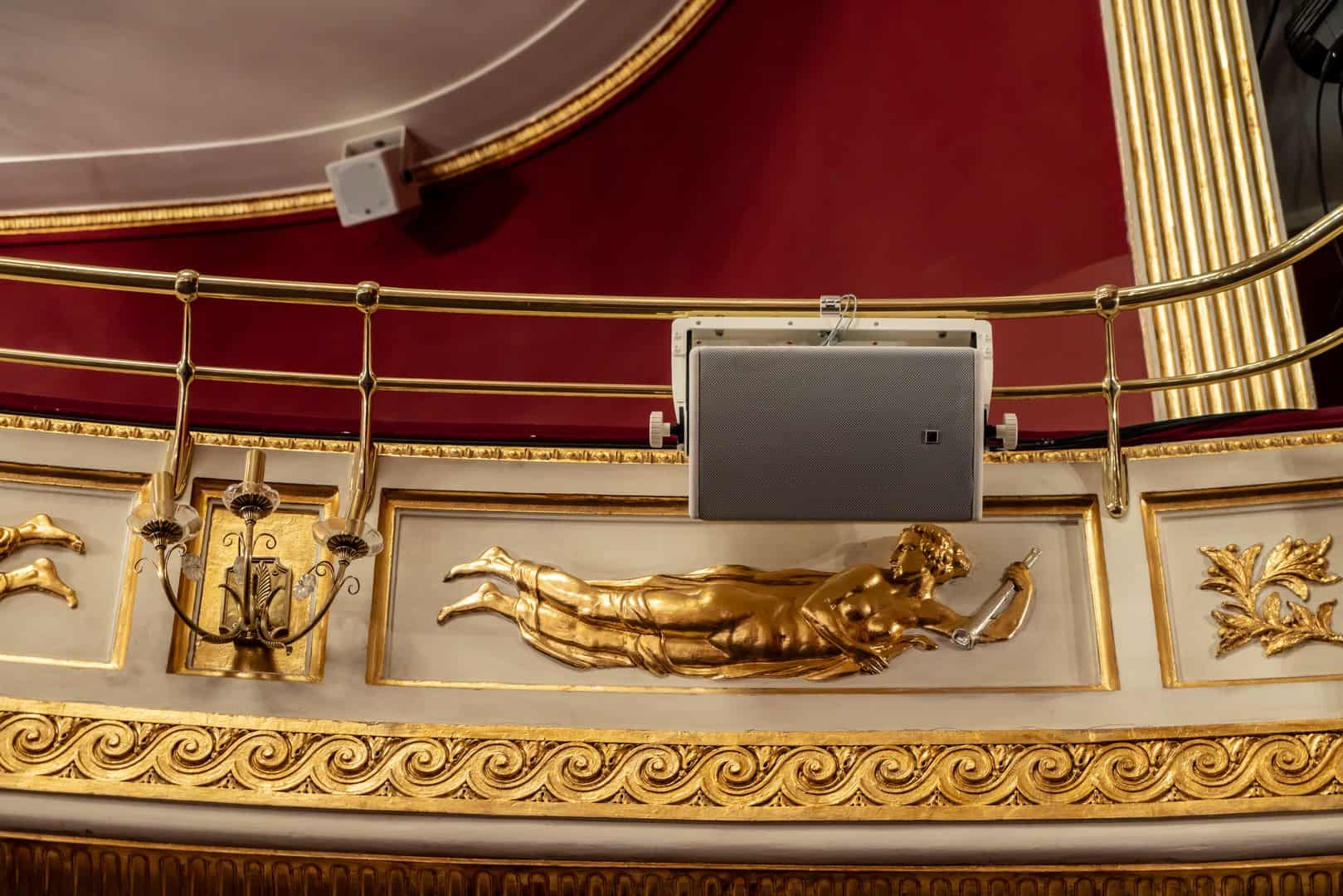 Gdy mówimy o remoncie i modernizacji obiektu, musimy mieć na uwadze bardzo istotną kwestię – jest to budynek zabytkowy, zachowanie jego charakteru było zatem priorytetem. Instalacja nowoczesnej technologii nie może się kłócić z wystrojem, wymagać jego zmiany – dlatego wszystkie prace odbywały się pod nadzorem konserwatora zabytków. Wnętrze Teatru Wielkiego ma swój klimat, wywodzący się z epoki, w której nie było jeszcze tego typu nagłośnienia, jak współcześnie, zatem każdy podwieszony gdzieś zestaw może potencjalnie jawić się jako element obcy, niemal inwazyjny. I tu warto podkreślić, że z punktu widzenia tego miejsca zastosowanie nagłośnienia immersyjnego ma jeszcze jedną, nie tak oczywistą zaletę. Tradycyjne nagłośnienie (zwykle zatem stereofoniczne) opiera się na masywnych, podwieszonych gronach, znajdujących się po bokach sceny i raczej trudnych do dyskretnego ulokowania. Rozmiar ma tu znaczenie. Dźwięk immersyjny rządzi się innymi prawami, głośników jest dużo, ale są one rozlokowane po całej sali i mogą być zdecydowanie mniejsze, bo finalny efekt daje ich suma, a nie nagromadzenie w jednym miejscu. Co sprawia, że łatwiej je wkomponować w wystrój. Warto zauważyć, że w omawianym wypadku zadbano nawet o odpowiednią kolorystykę zestawów głośnikowych, w większości purpurowych, doskonale dopasowanych do ścian, kotar itd. Łącznie cały system nagłośnienia immersyjnego składa się z 120 głośników oraz szeregu wzmacniaczy, dysponujących ponad 130 kanałami. Powyżej okna sceny, na ścianie portalowej, podwieszono 26 zestawów, ale ze względu na to, co napisano przed chwilą, w żaden sposób nie zakłócają wystroju, ani nie odciągają uwagi widza od tego, co dzieje się na samej scenie. Konkretnie mówiąc, jest to po 10 sztuk modeli liniowych A15i Focus oraz A15i Wide, uzupełnionych o 6 subwooferów KS21i (o tych wszystkich zestawach mieliśmy już zresztą okazję pisać na naszych łamach). W proscenium zaś wbudowano 12 małych zestawów frontfill, w tym wypadku 5XT. Wszystko to zasilane wzmacniaczami LA7.16i oraz LA4X. Z kolei na sali, oprócz linii frontowej, zamontowano łącznie ponad 80 głośników punktowych, tworzących system nagłośnienia efektowego (immersyjnego). Część z nich także wariancie purpurowym, część czarnym, a część białym – wszystko po to, by zachować spójność z wystrojem. Tutaj mamy na przykład 4 sztuki X8 na ścianach bocznych, 14 sztuk 5XT pod pierwszym balkonem, a kolejne 6 sztuk X8 na nim. Pod drugim balkonem zainstalowano 14 głośników 5XT, zaś nad nim 12 X8, a kolejne 10 głośników X8 znalazło się pod sufitem (są ukryte za specjalną siatką) i wreszcie 2 w konstrukcji żyrandola – wspomniane tu dwie ostatnie grupy stanowią głośniki elewacyjne. Tę część instalacji nagłośnieniowej napędza wzmacniacz LA7.16i. W ramach systemu aktywnego wsparcia akustyki zainstalowano dodatkowe 20 głośników 5XT nad drugim balkonem, zasila je jeszcze jeden wzmacniacz LA7.16i. Skomplikowany system nagłośnienia to jednak nie tylko podwieszone zestawy, wzmacniacze, procesory – to także całe okablowanie, w tym wypadku naprawdę wymagające wielu połączeń (wykorzystano kable Klotz i osprzęt Neutrik). To także duże wyzwanie, jak je ukryć, poprowadzić bez potrzeby dewastowania zabytkowego wnętrza, wiercenia w ścianach itd. Jak wspomina Grzegorz Stasik: „Budynek jest nietypowy. Jest masa kanałów technicznych, wentylacyjnych, różnych przestrzeni, którymi można było ułożyć okablowanie, a nie od razu wiercić i psuć ten zabytkowy obiekt. Szczególnie ciekawie wyglądała instalacja głośników sufitowych. Jest tam bardzo mało przestrzeni, ciasno, sufit podwieszono na dużej ilości prętów, więc przemieszczanie się tam to była katorga. Tę przygodę zapamiętam na długo”.