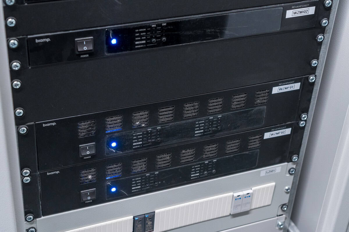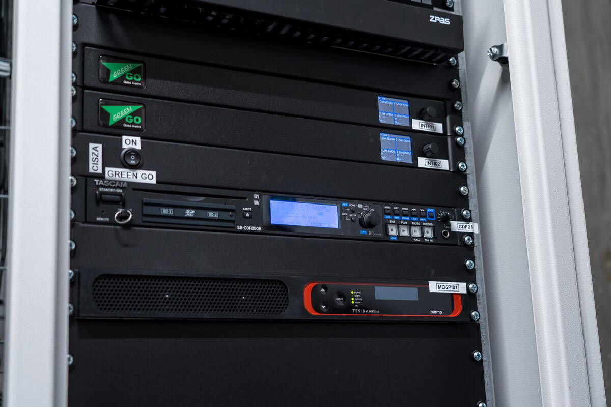 Poza doskonałym systemem nagłośnieniowym, czy bardzo rozbudowanym parkiem oświetleniowym, obiekt dysponuje również systemem interkomowym Green-GO (z pulpitami nablatowymi, ściennymi oraz beltpackami bezprzewodowymi), który w znakomity sposób ułatwia komunikację między sceną, garderobami, projektorownią czy reżyserkami, a komunikacja odbywa się w sposób niezakłócony i niezakłócający odbioru. Ponadto w korytarzach został zainstalowany system rozgłoszeniowy, przy pomocy którego widzowie są informowani o tym, ile czasu pozostało do rozpoczęcia przedstawienia, stosuje się go też do odtwarzania gongów czy transmitowania komunikatów głosowych informujących np. o opóźnieniu w rozpoczęciu koncertu. System bazuje na rozproszonych w całym budynku, niewielkich, ale bardzo skutecznych głośnikach sufitowych Biamp CM20T, głośnikach ściennych MASK4CT-W oraz głośnikach Biamp MASK6CT-BL do nadawania komunikatów na scenę. Głośniki te są zasilane przy pomocy wzmacniaczy Biamp REVAMP 2060T oraz REVAMP 4120T, natomiast za sterowanie całym systemem rozgłoszeniowym odpowiedzialny jest procesor TesiraFORTÉ AI. Warto wspomnieć również, że w całym budynku zostały także zainstalowane ekrany informacyjne LG UH5J-H z systemem SuperSign, na których są wyświetlane informacje o repertuarze, nadchodzących wydarzeniach czy organizowanych przez centrum zajęciach.