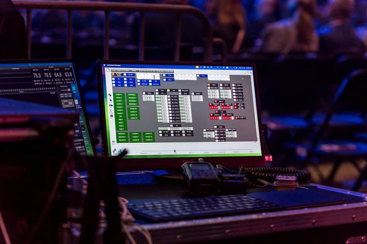 Mamy tutaj sześć subwooferów KS28 podwieszonych w formie dwóch gron, po sześć modułów i skonfigurowanych w układzie kardioidalnym, tak aby zapobiec wracaniu niskich częstotliwości, gdzie mamy wielu artystów, a co za tym idzie również wiele pracujących mikrofonów. Co więcej, grona skierowaliśmy do zewnątrz, tak aby zapobiec nakładaniu się niskich częstotliwości na środku oraz powstawania filtra grzebieniowego. Moim zdaniem usunięcie subwooferów z podłogi, szczególnie gdy mówimy o trasie koncertowej, jest świetnym pomysłem. Wynika to przede wszystkim z tego, że gramy w bardzo zróżnicowanych obiektach, które mają różną konstrukcję. W części z nich subwoofery ustawione przed sceną sprawdziłyby się świetnie, a w innych dramatycznie źle. Jest to związane przede wszystkim związane z tym, że niektóre obiekty pod podłogą mają np. instalację wodną dla potrzeb lodowiska, a inne nawet pusty basen. Tak naprawdę nie wiesz, czego możesz się spodziewać w danej hali i jaki będzie miało to wpływ na ustawione na podłodze subwoofery. Taka pusta przestrzeń pod płytą działa jak wielkie pudło rezonansowe. Wieszając zestawy niskotonowe, masz zawsze pełną powtarzalność, co dla mnie jest zdecydowanie lepszym rozwiązaniem. Dostępne rozwiązania techniczne i wiedza projektantów i inżynierów systemów sprawia, że jesteśmy w stanie poradzić sobie już dzisiaj z większością problemów występujących w halach, w których gramy.
