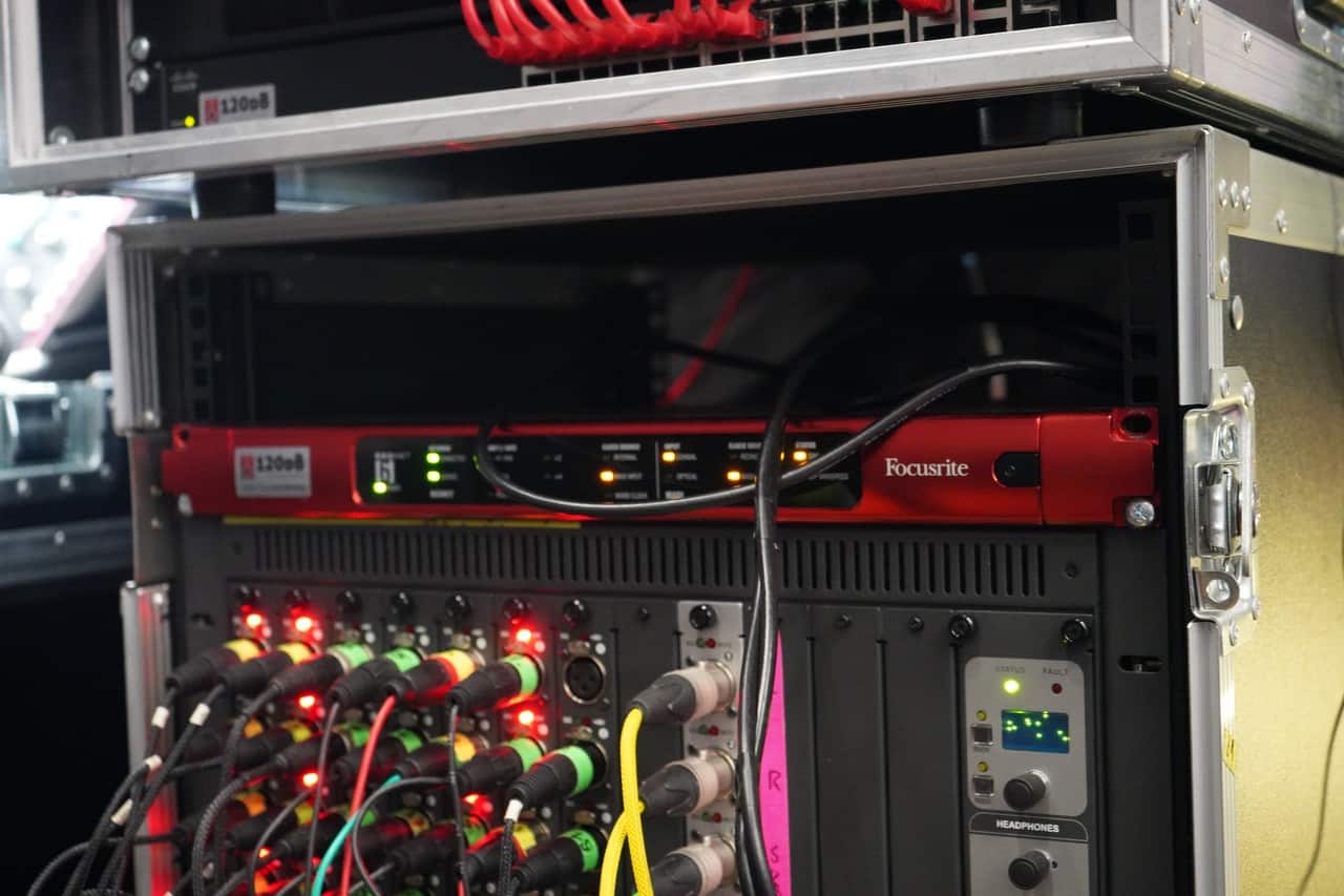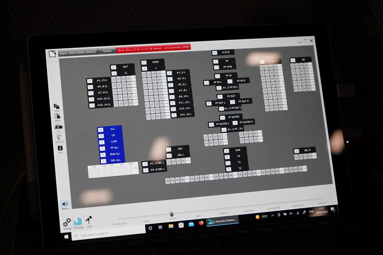 Na stanowisku FOH pracowała konsoleta Avid S6L-24C – najnowszy nabytek Piotra Puchalskiego i jego firmy Acoustic Soul. Jak sam mówi, to była miłość od pierwszego wejrzenia, ponieważ konsoleta oferuje dużą swobodę działania, komfort i bezpieczeństwo. „Miks przygotowany wcześniej w studiu brzmi na koncercie bardzo dobrze i praktycznie nie wymaga żadnych poprawek. Deska oferuje znakomite preampy i wysokiej klasy emulacje procesorów. Chciałem również, żeby nic mnie nie ograniczało w pracy, a umówmy się, ten stół potrafi znacznie więcej niż to, z czego korzystam w chwili obecnej.” – dodaje realizator sanah. Na „Uczta Tour’22” Piotr przygotował 55 piosenek, wykorzystując ogromny potencjał konsolety (snapshoty, timecody, markery, fady ect). Dodatkowo Avid został rozbudowany o rack pluginów, które doskonale sprawdzają się podczas pracy na żywo. Przesył sygnałów odbywał się z wykorzystaniem splittera MADI w stageracku, następnie całość trafiała do interfejsu Focusrite RedNet, skąd za pośrednictwem Dante sygnał trafiał, między innymi, do konsolety monitorowej.