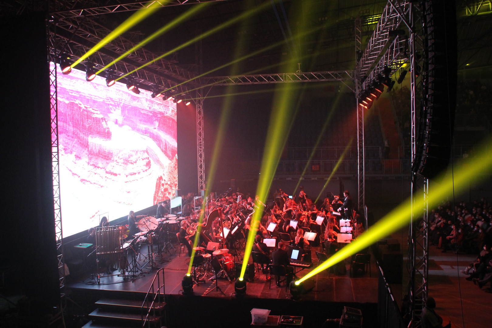 A gdy chodzi o oświetlenie, od razu rzucają się w oczy sprawdzone klasyki: – Światło również wozimy ze sobą, cały czas ten sam zestaw i ten sam realizator, Piotr Pacanowski wraz z technikiem Jackiem Kuźmińskim. To są Martin Quantum Wash’e, Martin Quantum Profile, kilka głów Robe Pointe, trochę blinderów naszej własnej marki S-Lighting. Światło pełni w tym koncercie rolę bardziej ambientową i dekoracyjną – inaczej niż w przypadku koncertów bez wizualizacji – nie buduje całego obrazka. Podstawą jest to, co się dzieje na ekranie. Światło ma zapewnić widoczność orkiestry, ma kolorem i dynamiką dopasować się do tego, co się dzieje na ekranie.