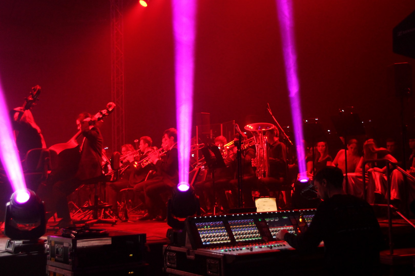 Już na pierwszy rzut oka widać, że klasyczny skład symfoniczny został obudowany technologią rodem z XXI wieku. Z jednej strony chodzi o stworzenie nowoczesnego i atrakcyjnego dla odbiorcy widowiska, z drugiej zaś o połączenie ze sobą wielu elementów, jak projekcje wideo, światło czy, przede wszystkim, odpowiednie nagłośnienie – pamiętajmy, że koncerty odbywają się głównie w miejscach, które nie są typowymi salami koncertowymi i stricte akustyczna orkiestra nie zabrzmiałaby w nich dobrze. W tym wszystkim słowo klucz – synchronizacja jest odmieniana przez wszystkie przypadki. Grzegorz zresztą przyznaje, że jest wręcz pasjonatem synchronizowania wszystkiego ze wszystkim. Spytałem więc o skalę trudności całego przedsięwzięcia i jak wygląda jego realizacja od strony technicznej: – Jeśli chodzi o warstwę techniczną, to trudnością były dwa aspekty. Po pierwsze, miksowanie całej orkiestry, bo tak naprawdę do zmiksowania jest ponad 100 przelotów – biorąc pod uwagę wszystkie mikrofony, powroty efektów, loopy, klik dla dyrygenta i orkiestry, konferansjerów, całą komunikację wewnętrzną, która też jest realizowana przez mikser; łącznie na desce jest zajętych około 120 kanałów. Druga trudność polegała na tym, że wszystko musi pracować synchronicznie, więc całą pracę zacząłem od przejrzenia partytury i przygotowania plików wav z metronomem dla dyrygenta i orkiestry, razem z podpowiedziami głosowymi kiedy kto ma wejść. Z tymi plikami pojechałem na próbę orkiestry, nagraliśmy wszystkie utwory na dwie pary mikrofonów i dopiero pod taki dźwiękowy szkic, tzn. robocze nagranie połączone z metronomem, ekipa montowała pliki video. Żeby to wszystko mogło działać cała orkiestra gra w słuchawkach, mają tam klika, mają również głos dyrygenta, który przez cały koncert ma mikrofon na głowie i w ten sposób dyryguje – poza batutą, może swobodnie mówić cały czas do swoich muzyków. My zresztą też mamy w reżyserce małe shoutboksy, w których cały czas słuchamy uwag Adama. Moim zadaniem w tej chwili na samym koncercie jest sprawienie, żeby wszystkie te systemy działały spójnie. Tutaj największą robotę robi program QLab, w którym jest zapisana cała lista utworów, a pod każdym tytułem kryje się seria komunikatów, to znaczy wysłanie metronomu do orkiestry, wypuszczenie loopów, wysłanie w odpowiednim momencie komunikatu do media serwera, żeby odpalił film, wysłanie komunikatu do deski, żeby wczytała scenę do odpowiedniego utworu, timecode do kolejnego komputera, gdzie jest Reaper z nagranymi wszystkimi śladami. Służy to do przeprowadzenia wstępnej wirtualnej próby i jest niejako zapasem, gdyby się nagle okazało, że któryś przelot przestał nam działać, możemy przepatchować ekspresowo deskę na tym jednym kanale na Reapera i synchronicznie, razem z orkiestrą, razem z metronomem, razem z materiałem wideo poleci to wszystko razem. Docelowo chciałem jeszcze zmobilizować świetlika do zaprogramowania świateł pod timecode, ale, mimo chęci, na razie nie było na to za dużo czasu. Przy tak dużej i skomplikowanej produkcji łatwo o czymś zapomnieć lub włączyć za wcześnie albo za późno. Dzięki automatyce cały koncert w dużym uproszczeniu można by sprowadzić do wciśnięcia 18 razy przycisku „GO”.