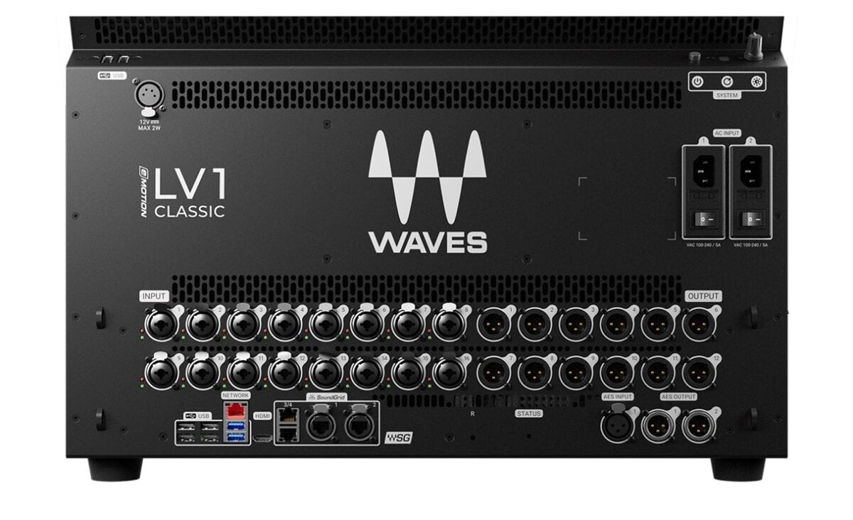 Waves LV1 Classic pozwala na przyjęcie i obsługę do 64 kanałów mono/stereo i zmiksowanie ich w ramach 44 szyn miksujących (busów). Na tylnym panelu konsolety znajduje się 16 wejść combo XLR/TRS z przedwzmacniaczami Waves oraz 12 wyjść również w formacie XLR. Dodatkowo producent wyposażył tylny panel w gniazdo wejściowe AES/EBU stereo oraz dwa gniazda wyjściowe w tym formacie, umożliwiające wysyłkę czterech niezależnych sygnałów (np. LR, Sub, Frontfill) bez potrzeby konwersji cyfrowo-analogowej podczas transmisji sygnału do kolejnych elementów systemu nagłośnieniowego. Stół wyposażony jest w cztery gniazda SoundGrid, do których można podłączyć urządzenia takie jak dodatkowe stageboxy IONIC 16 (16 wejść / 8 wyjść), IONIC 24 (24 wejścia / 14 wyjść), czy DSPRO StageGrid 4000 (32 wejścia / 16 wyjść analogowych + szereg wejść i wyjść AES/EBU). Oczywiście, do tych gniazd można również podłączyć dodatkowe serwery rozszerzające moc obliczeniową DSP lub urządzenia pracujące w protokole Dante. Konsoleta stanowi zatem doskonały punkt wyjścia – już w podstawowej konfiguracji imponująco wyposażony – a jednocześnie pozwalający na pełną personalizację w zakresie wejść, wyjść, konwersji oraz mocy obliczeniowej. Możliwości rozbudowy obejmują do 8 urządzeń jako Rack A, do 8 jako Rack B, 4 dodatkowe serwery, 4 serwery zapasowe oraz 4 urządzenia kontrolujące, takie jak np. dodatkowy Fader Bank. Jeśli chodzi o stabilność pracy, producent zadbał również o zasilanie redundantne. Na tylnym panelu znajdują się dwa zasilacze, które warto podłączyć do niezależnych źródeł zasilania.
