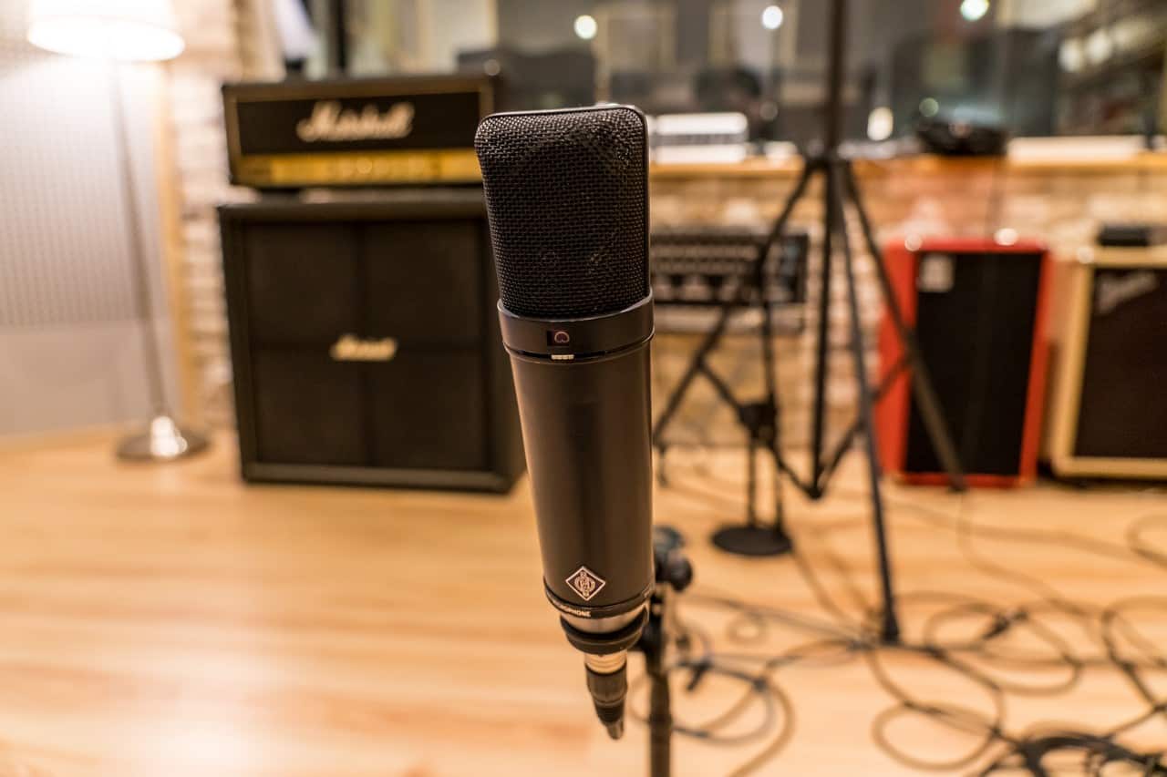 Studio Centrum jest wyposażone w najwyższej klasy sprzęt. Na pierwszym planie mikrofon pojemnościowy Neumann U 87.