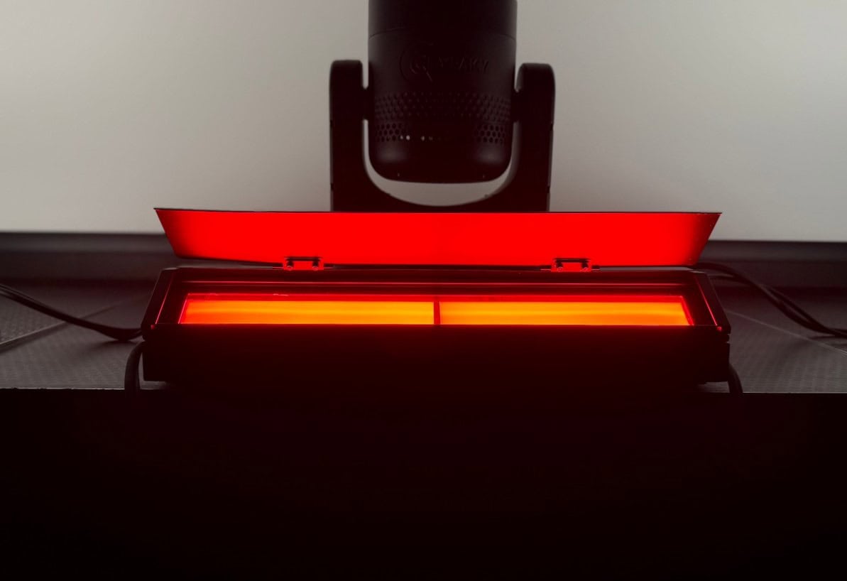 Rzeczywiście, czołowa, szklana część tuż nad źródłami światła została pokryta materiałem dyfuzyjnym, co praktycznie od razu powoduje równy rozkład plamy oświetleniowej, nawet przy bliskich odległościach w stosunku do oświetlanej płaszczyzny. Tu muszę znów podkreślić, że nie tylko sama obudowa, ale i część optyczna została zaprojektowana znakomicie. To naprawdę przemyślana oprawa i to w bardzo dostępnej klasie cenowej. Myślę, że przy kilku lub kilkunastu urządzeniach każdy element scenograficzny da się równomiernie pokryć światłem, stosując oczywiście te aparaty. Źródło światła stanowi zespół LED typu RGBW o mocy 80 W. Generuje on strumień o wartości 2173 lumenów. Co ciekawe, oprawa charakteryzuje się naprawdę wysokim współczynnikiem CRI. Producent podaje, że CRI wynosi 90. Ze względu na źródło oprawa posiada możliwość regulowania temperatury barwowej w sporym zakresie – od 1800 do 10 000 K, a samo źródło światła zostało podzielone na dwie niezależne sekcje. I tu, w zależności od trybu pracy, można pokusić się o różne warianty wykorzystania tej oprawy.